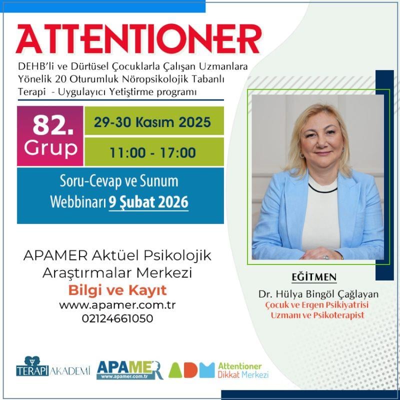 APAMER Aktüel Psikolojik Araştırmalar ve Eğitim Merkezi ve TerapiAkademi işbirliği ile organize edilen Çocuk Psikiyatrisi Uzmanı Dr. Hülya Bingöl Çağlayan tarafından verilecek olan ATTENTIONER - Dikkatimi Topluyorum 20 Oturumluk Yapılandırılmış Uygulayıcı Eğitimi 80.Grup Eğitimi 29-30 Kasım 2025 saat: 11:00-17:00 ve 19 Şubat 2026 19:30 – 22:00 tarihlerinde Zoom Pro platformundan online olarak yapılacaktır.